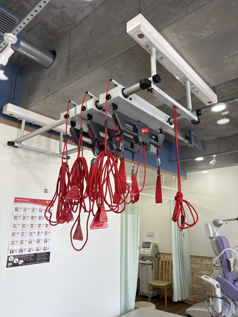 ロープに体をあずけることで、体の重さを軽くして動かせるので、関節や筋肉に無理なくリハビリができます。